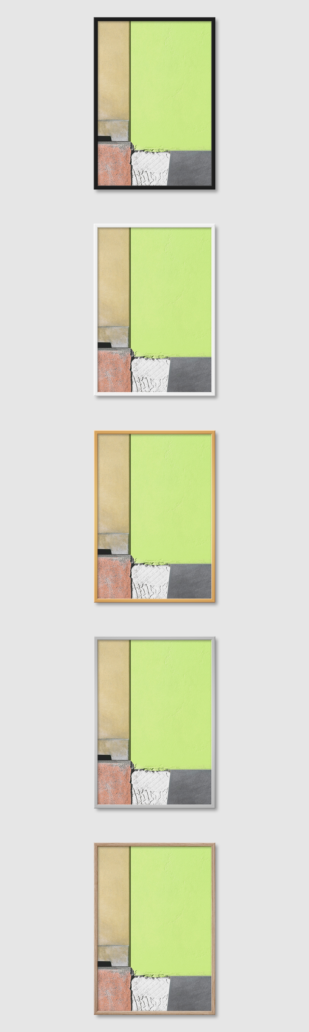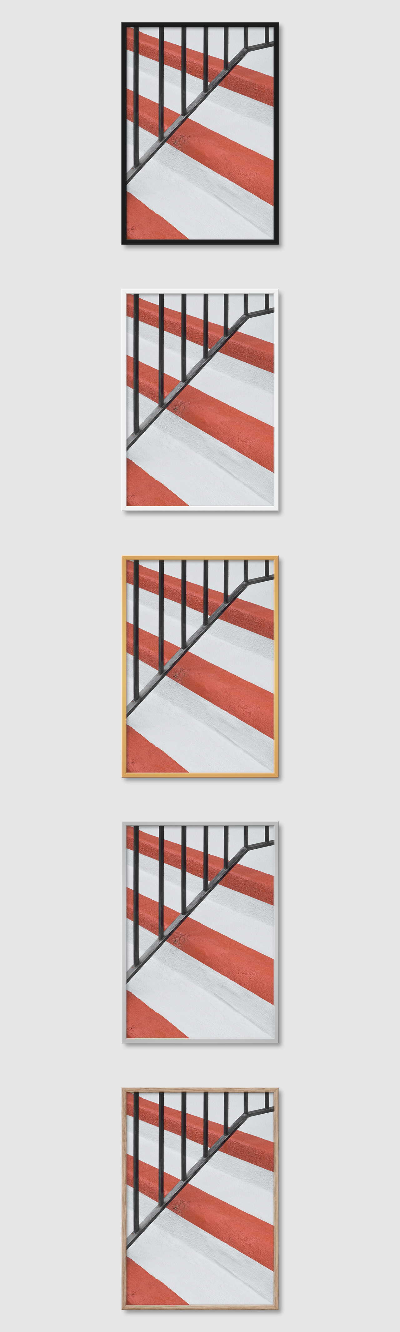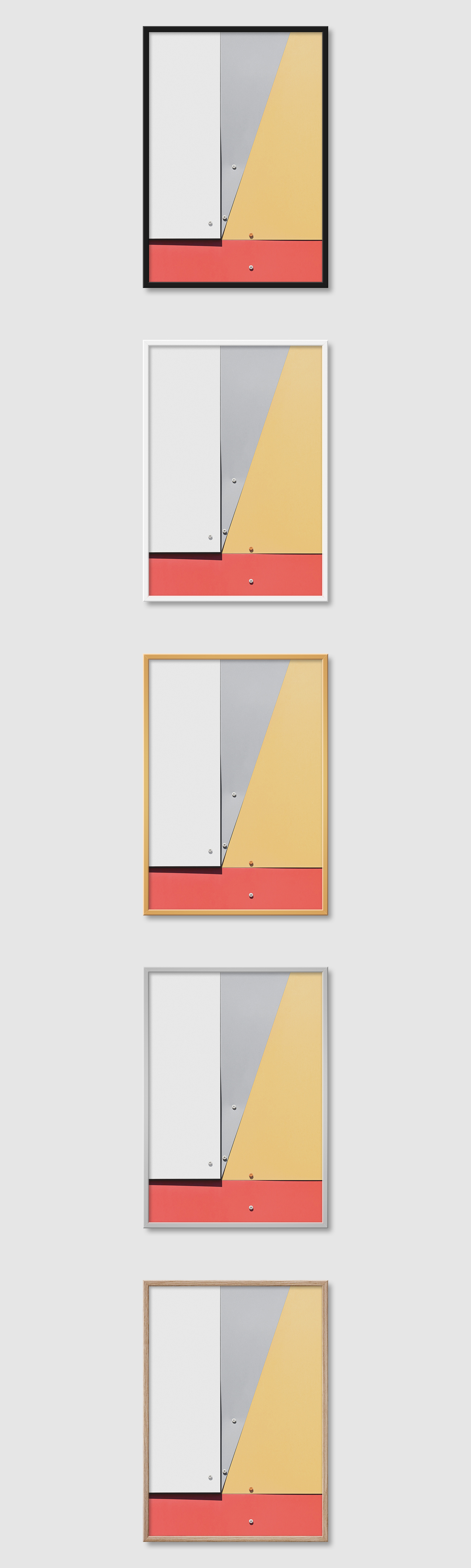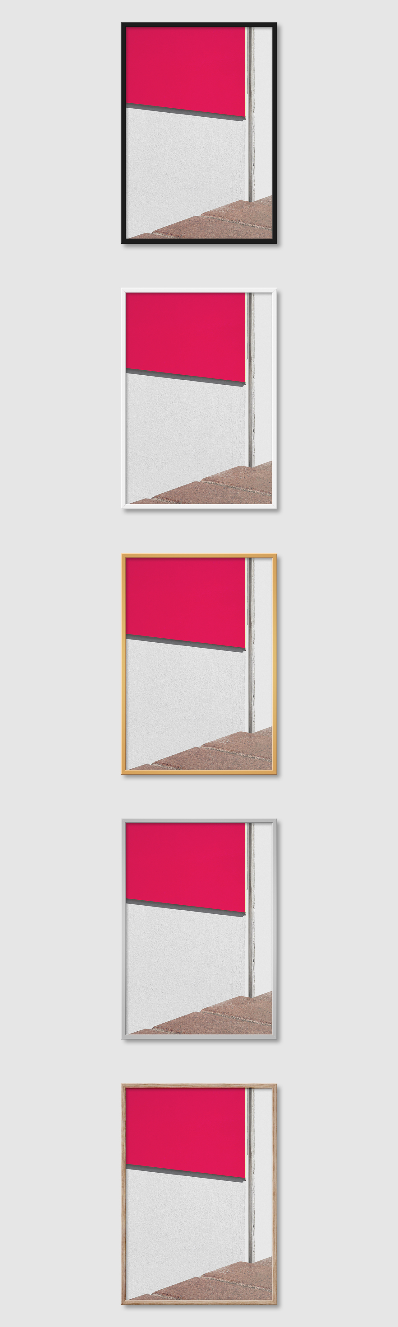 5가지 색상의 프레임 왼쪽부터 블랙, 화이트, 골드, 실버, 우드(무늬목)