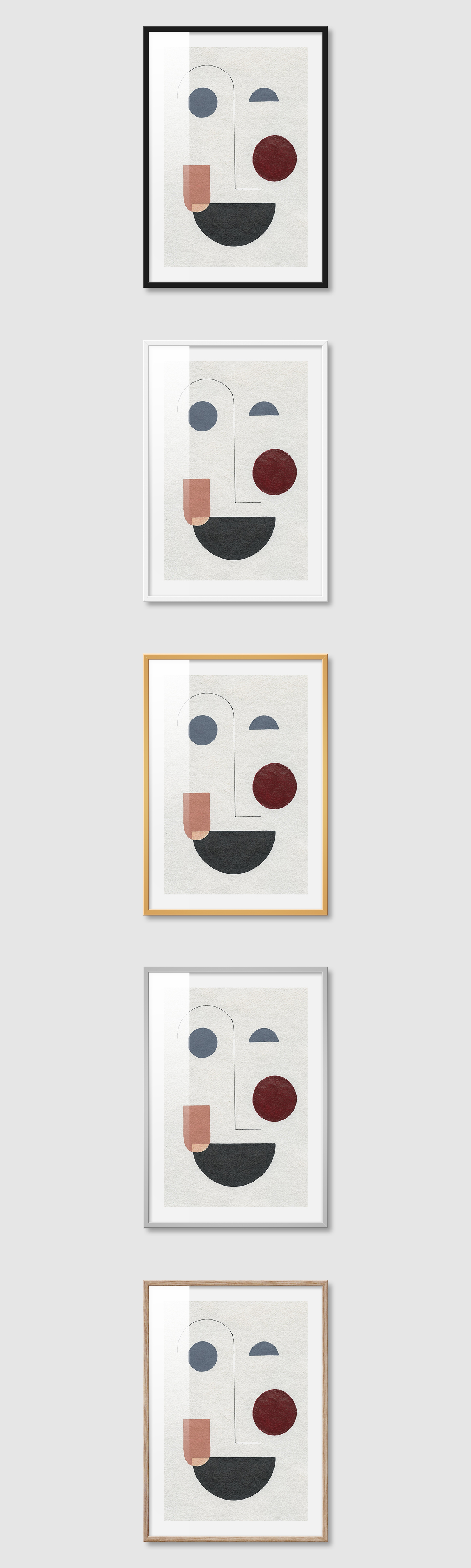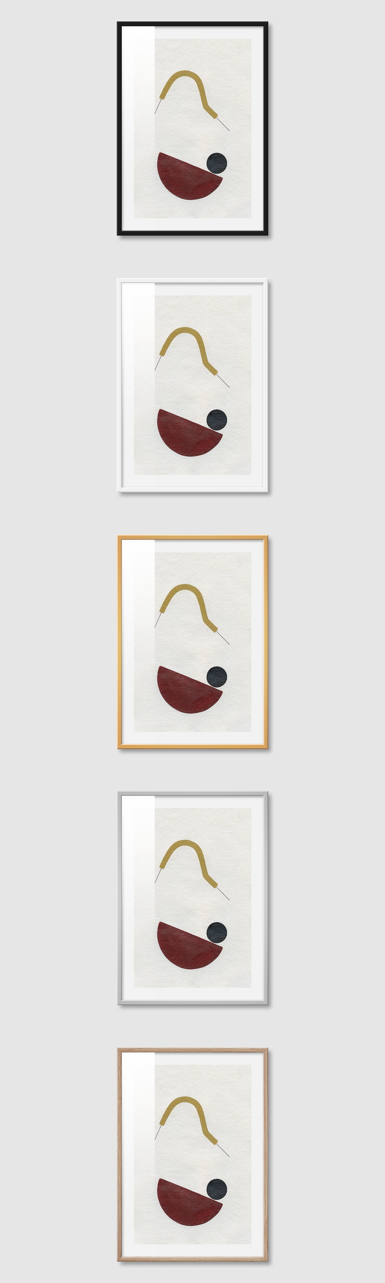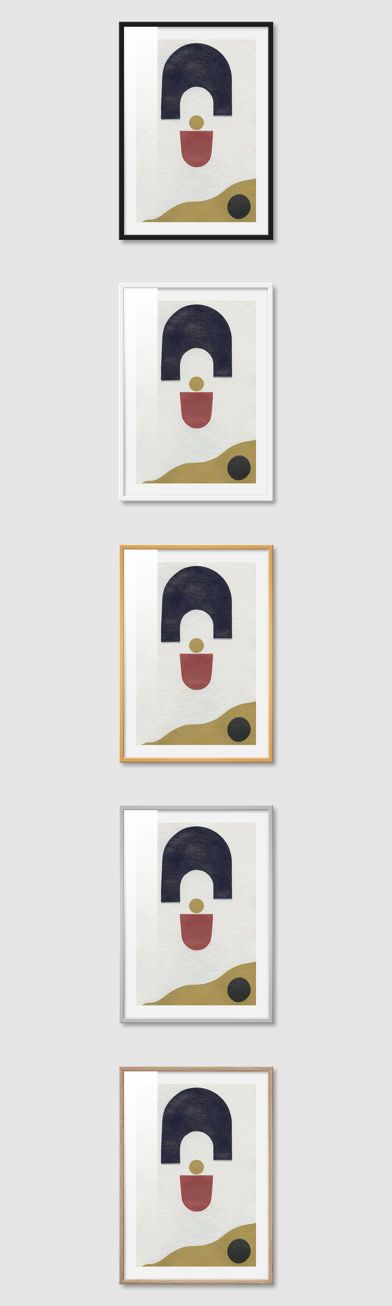 5가지 색상의 프레임 왼쪽부터 블랙, 화이트, 골드, 실버, 우드(무늬목)