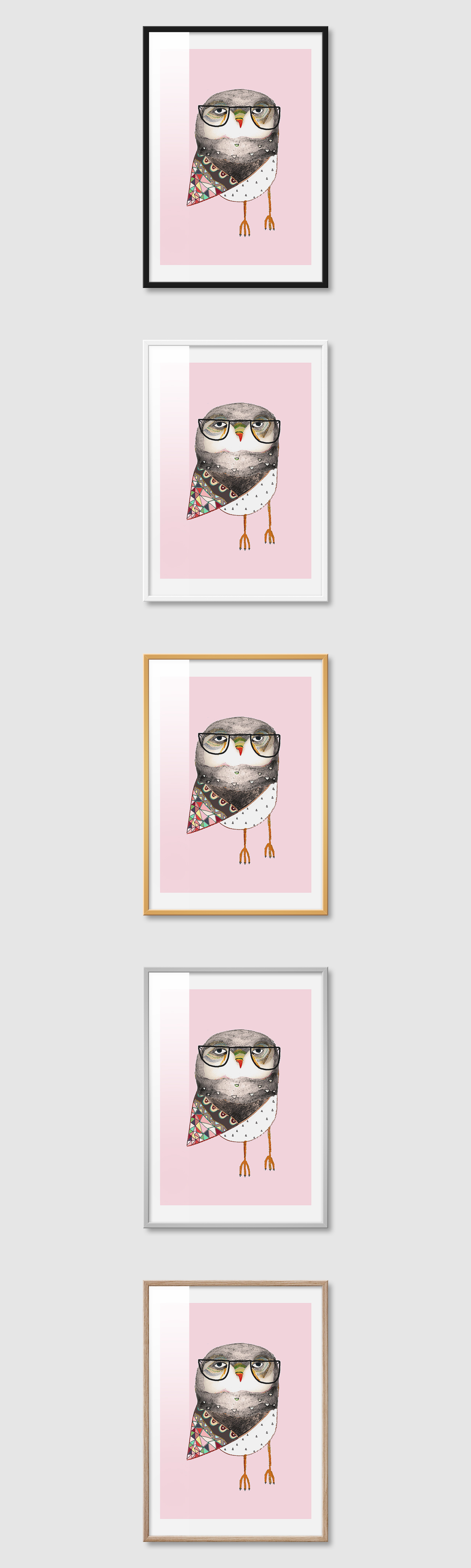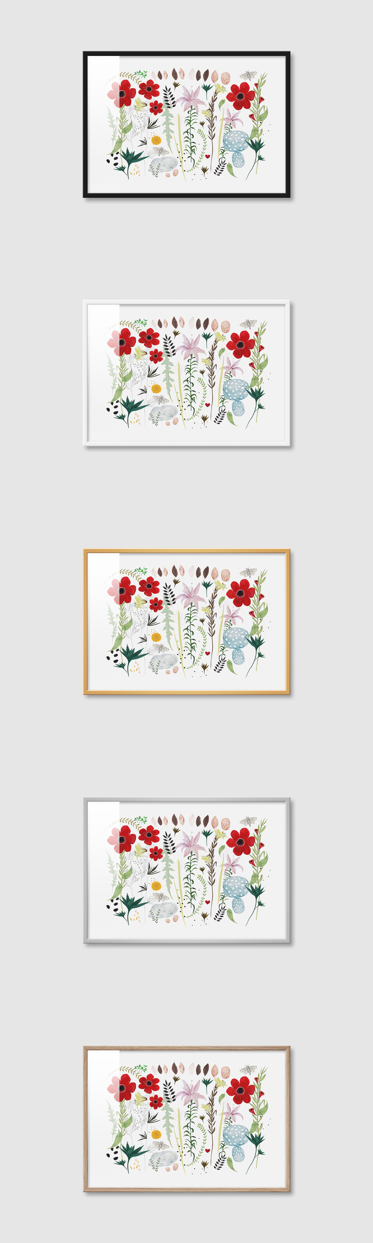5가지 색상의 프레임 왼쪽부터 블랙, 화이트, 골드, 실버, 우드(무늬목)