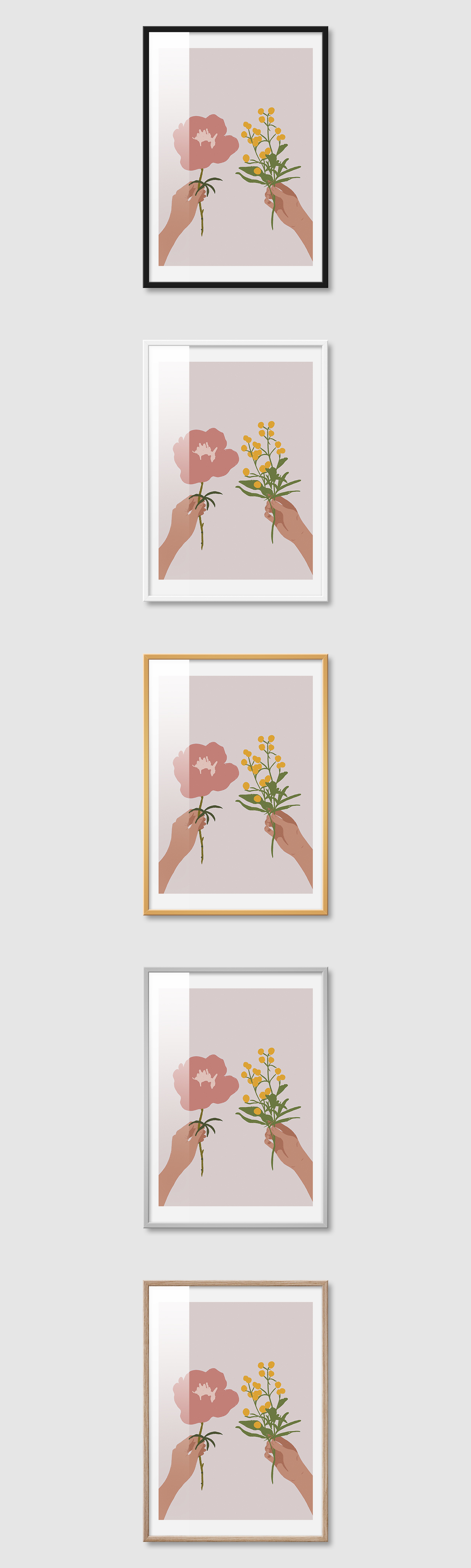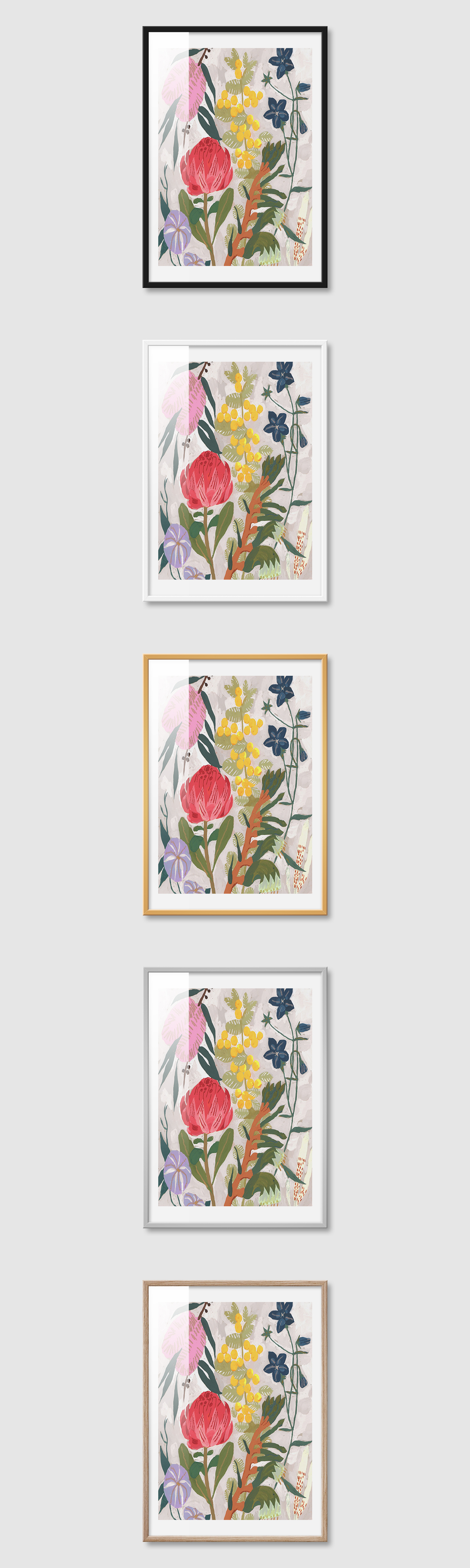 5가지 색상의 프레임 왼쪽부터 블랙, 화이트, 골드, 실버, 우드(무늬목)