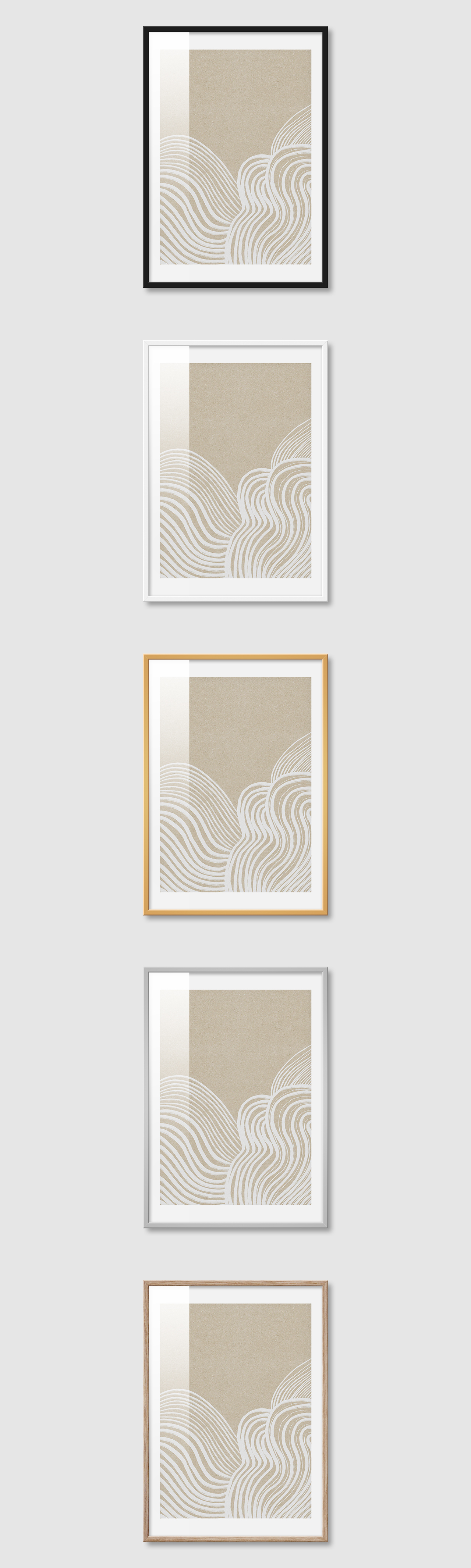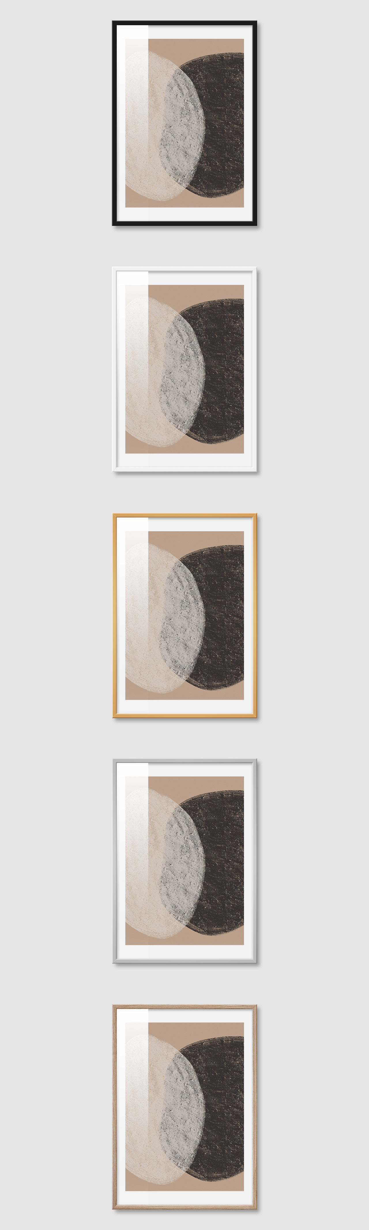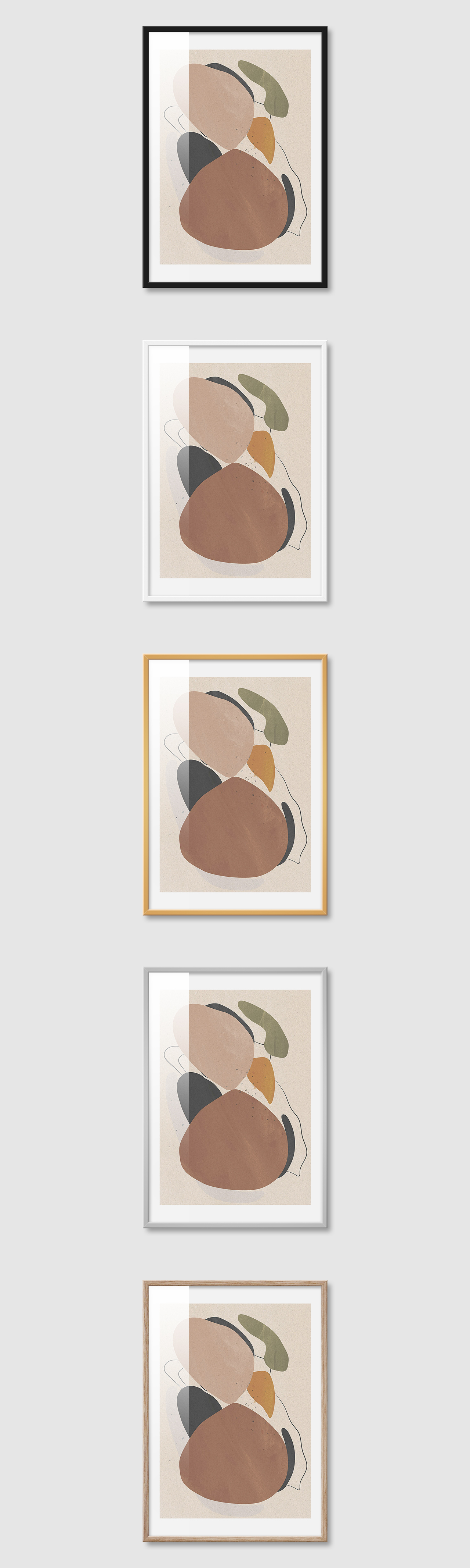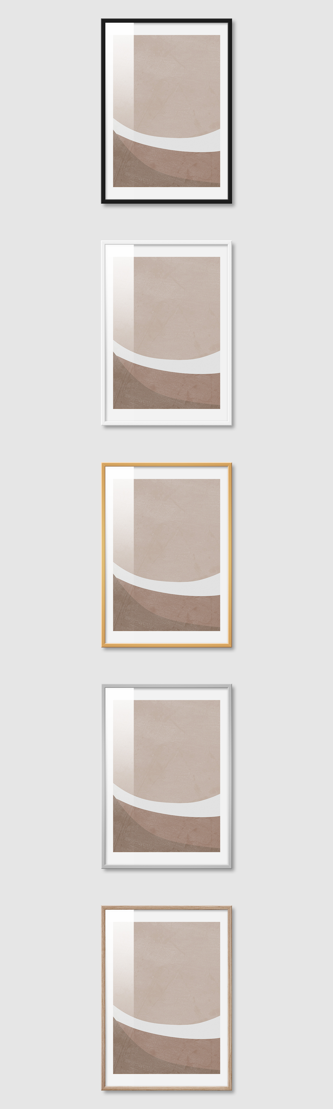 5가지 색상의 프레임 왼쪽부터 블랙, 화이트, 골드, 실버, 우드(무늬목)
