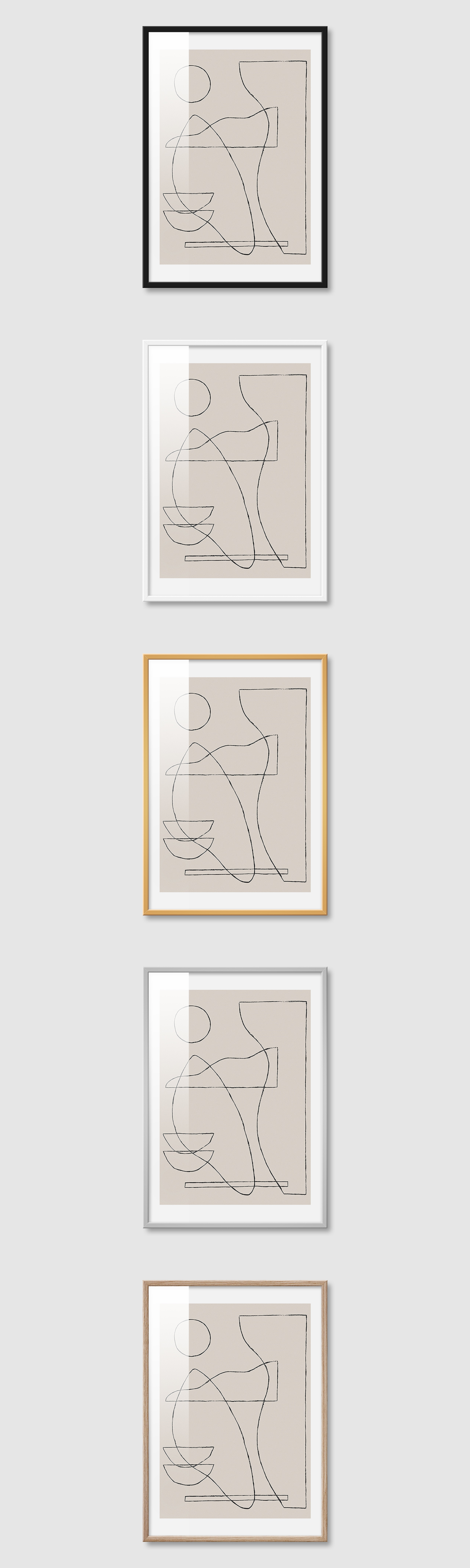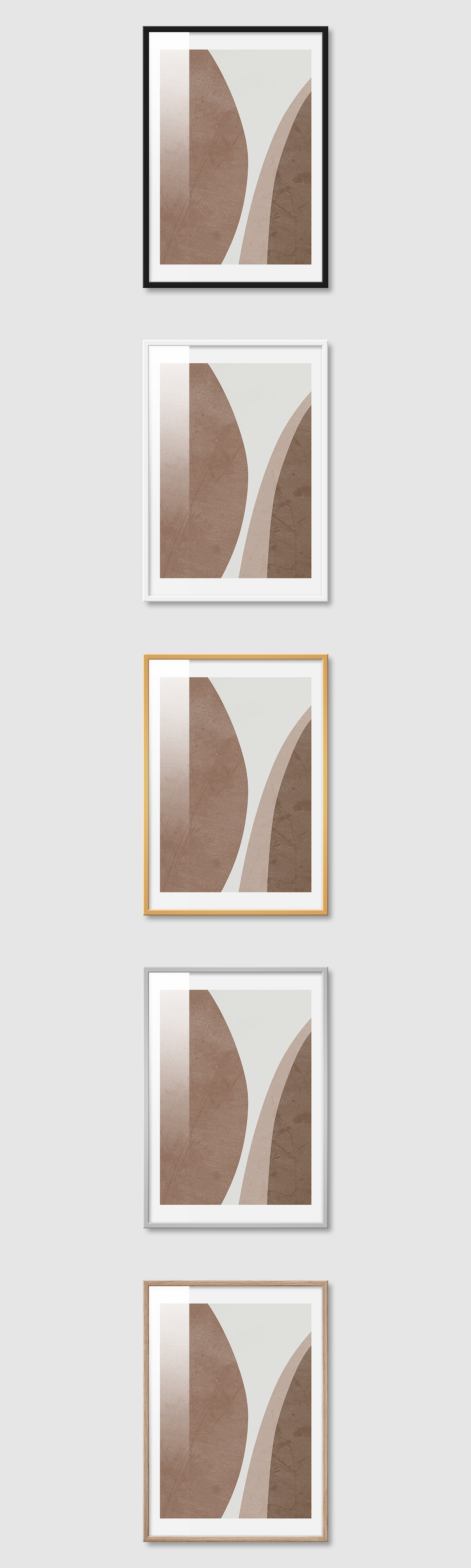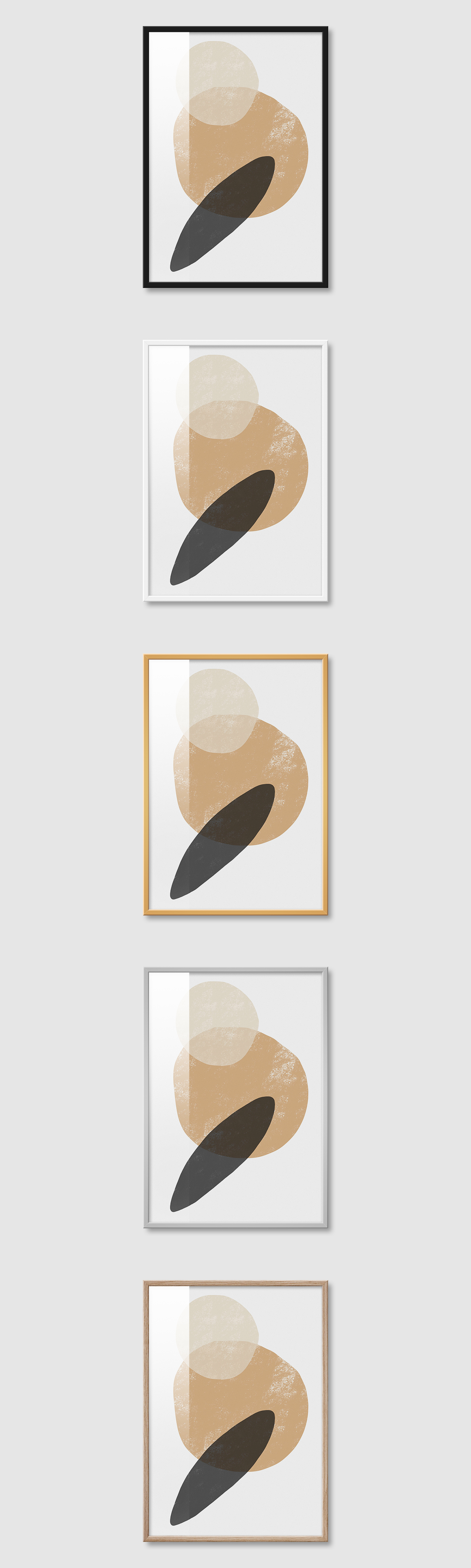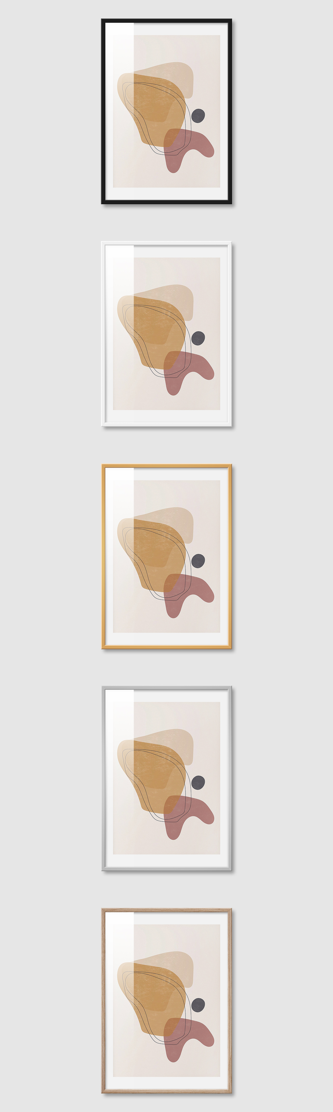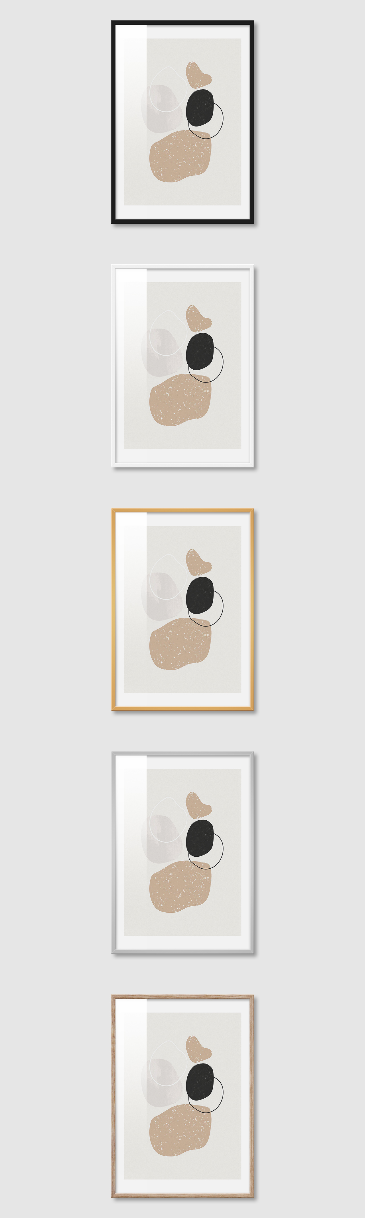 5가지 색상의 프레임 왼쪽부터 블랙, 화이트, 골드, 실버, 우드(무늬목)