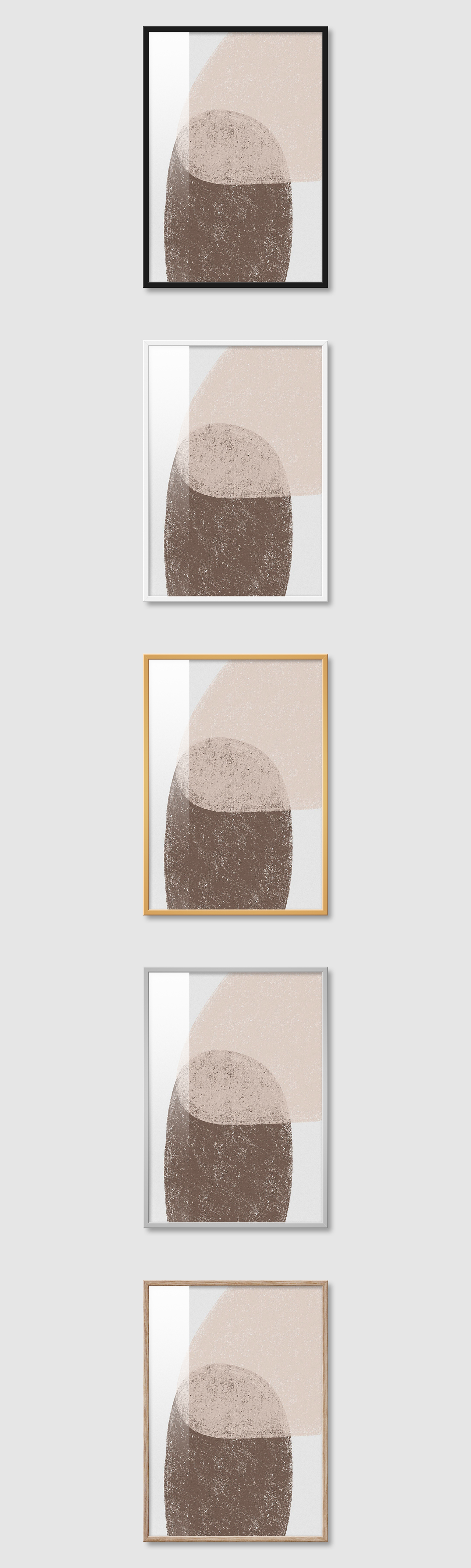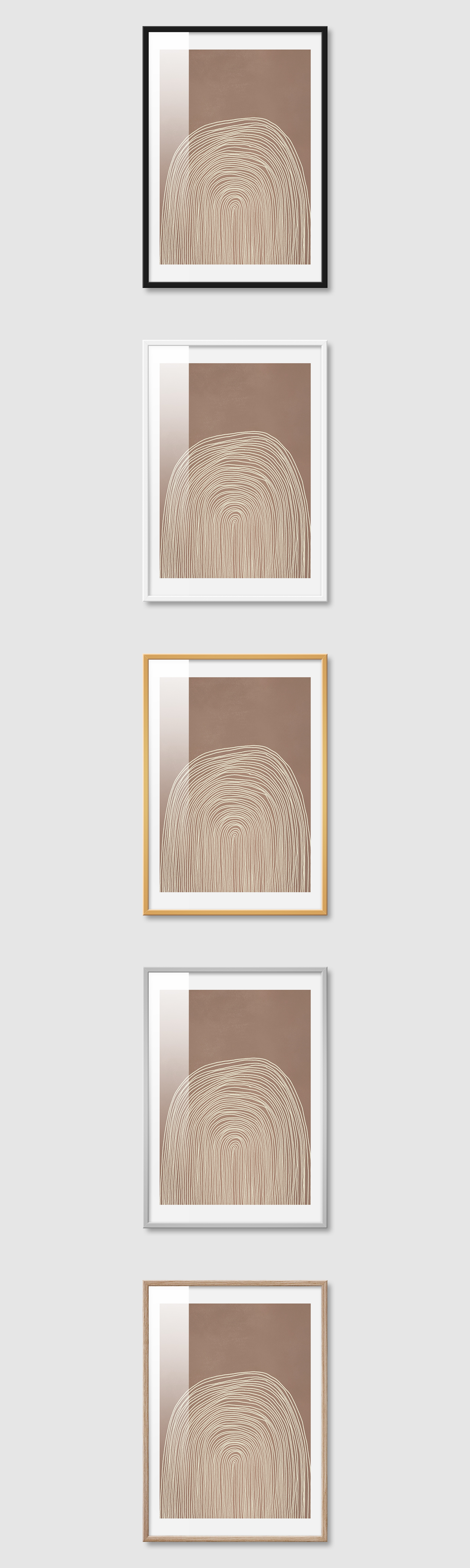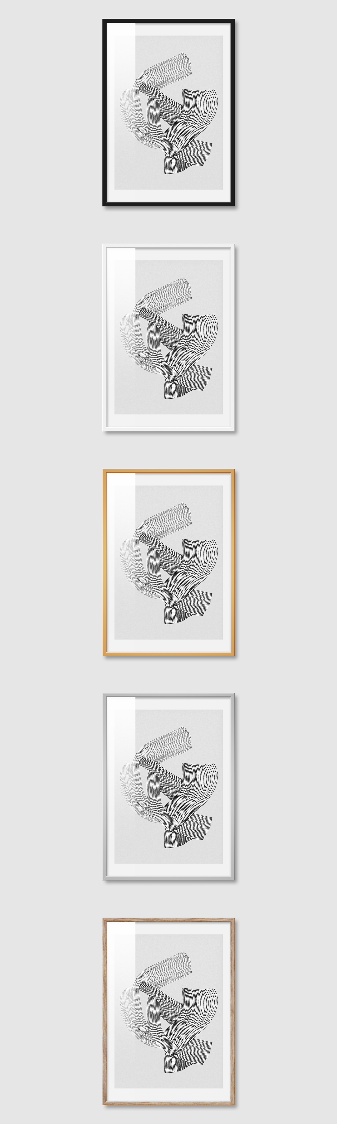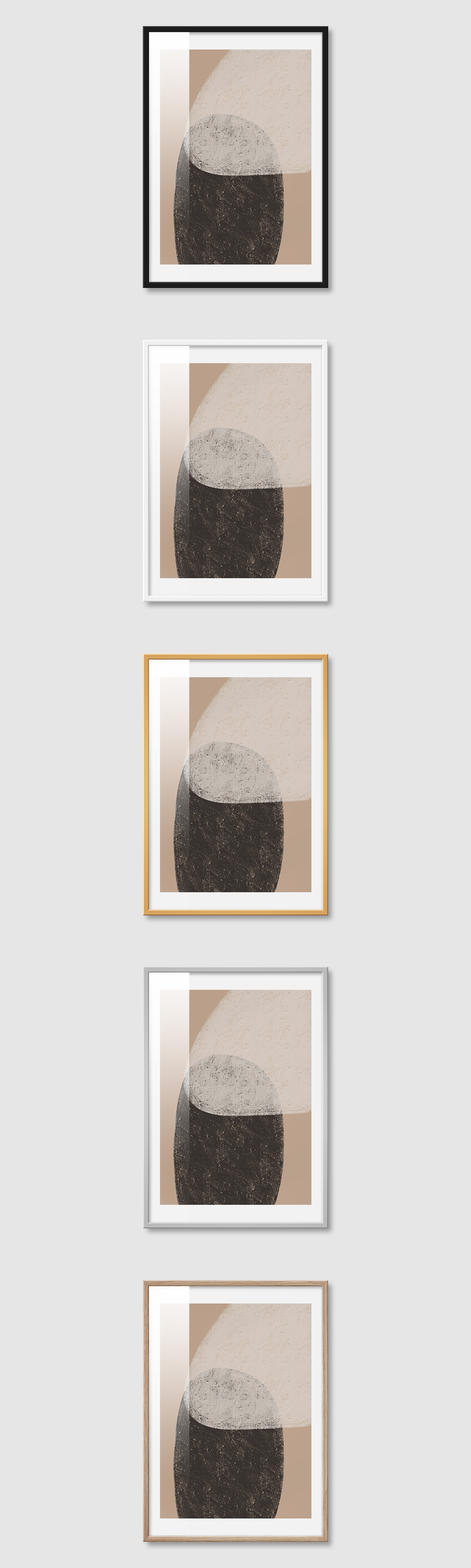 5가지 색상의 프레임 왼쪽부터 블랙, 화이트, 골드, 실버, 우드(무늬목)