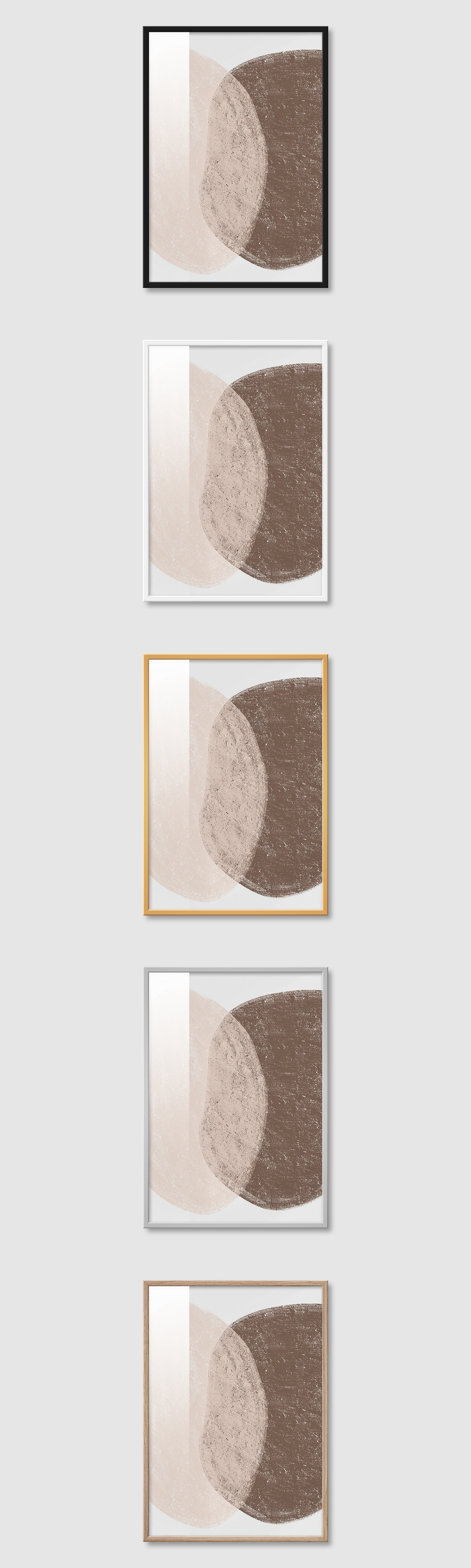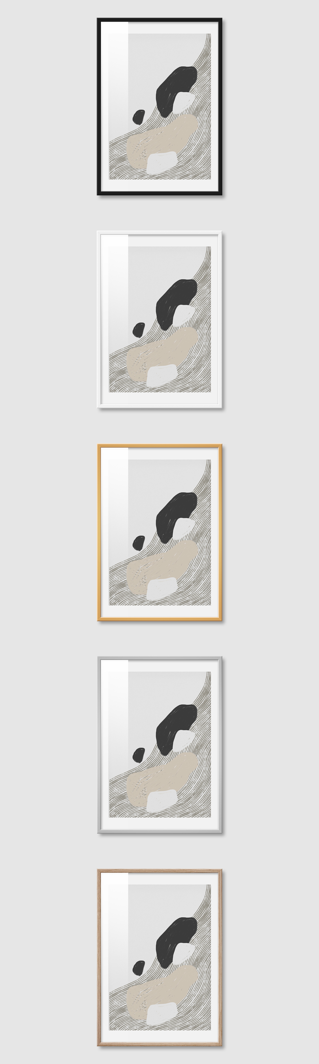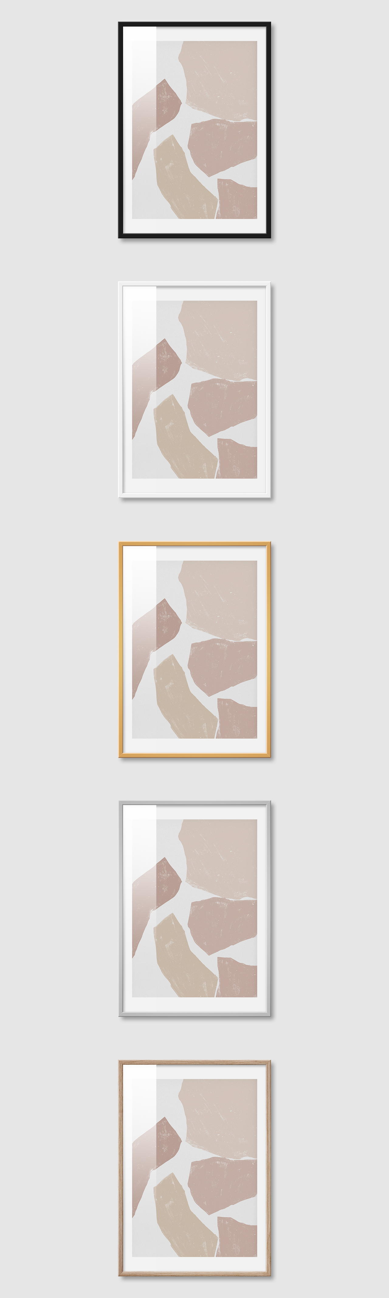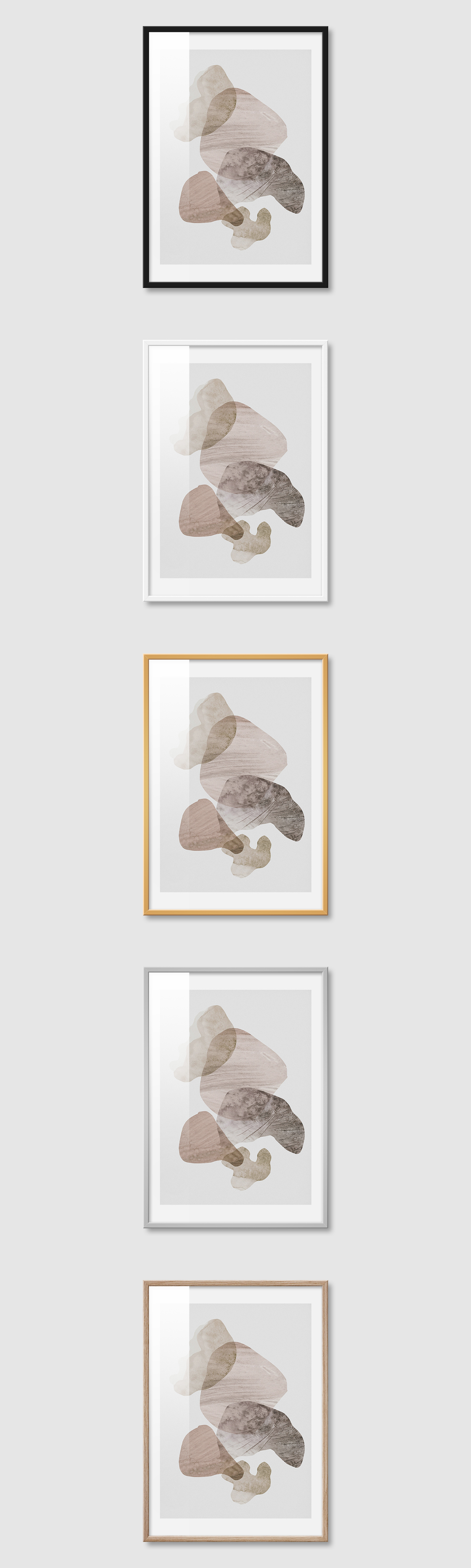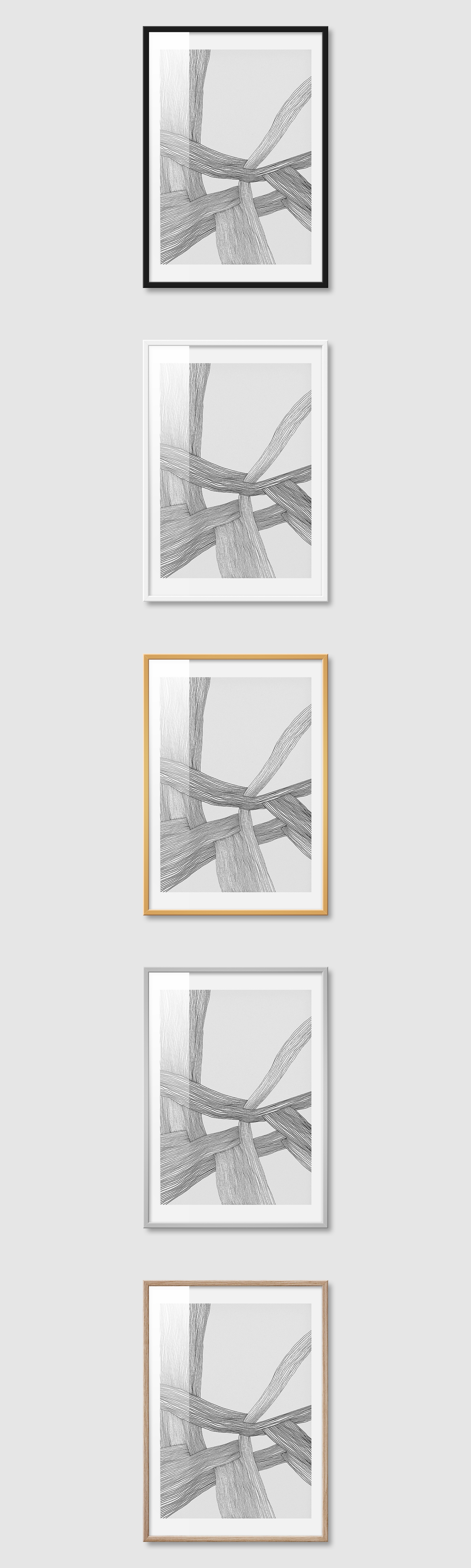 5가지 색상의 프레임 왼쪽부터 블랙, 화이트, 골드, 실버, 우드(무늬목)