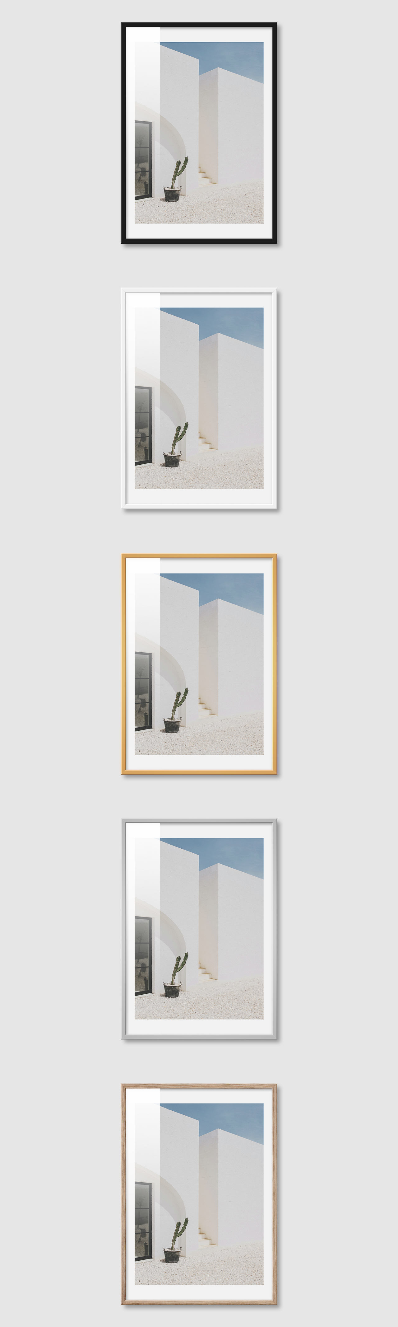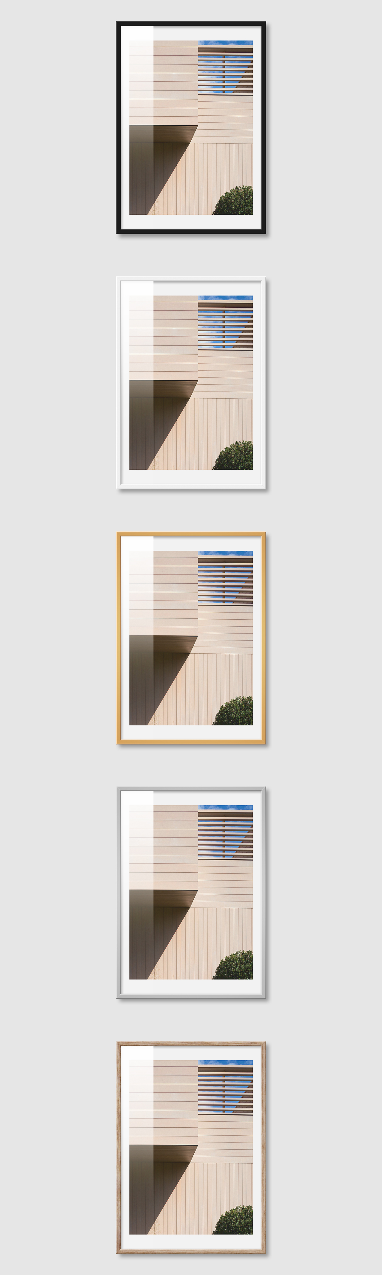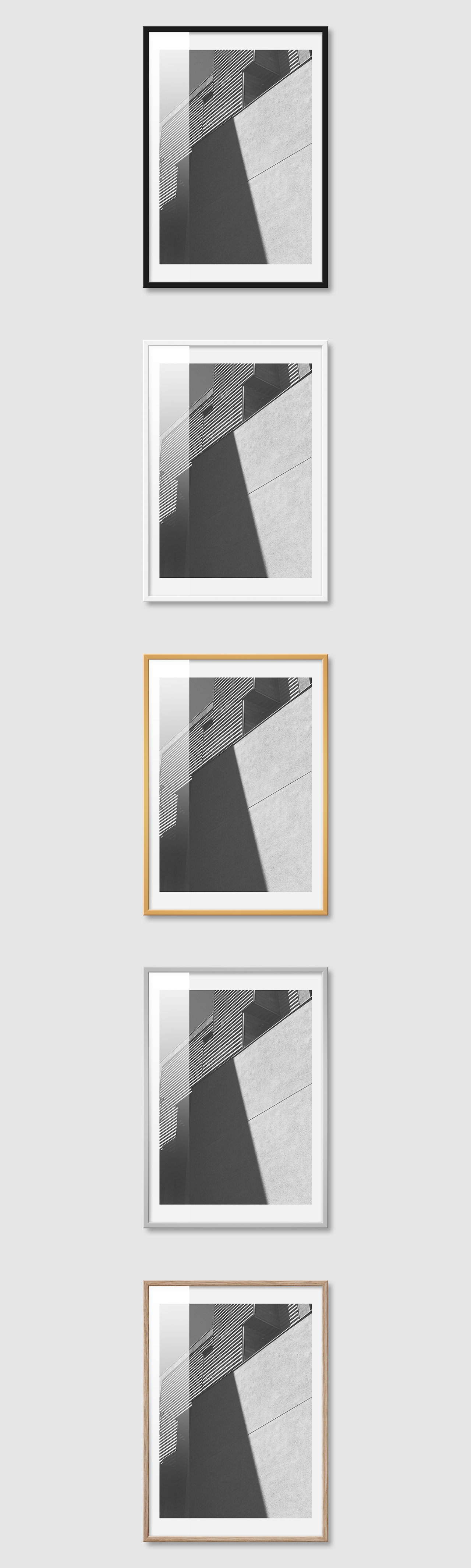 5가지 색상의 프레임 왼쪽부터 블랙, 화이트, 골드, 실버, 우드(무늬목)