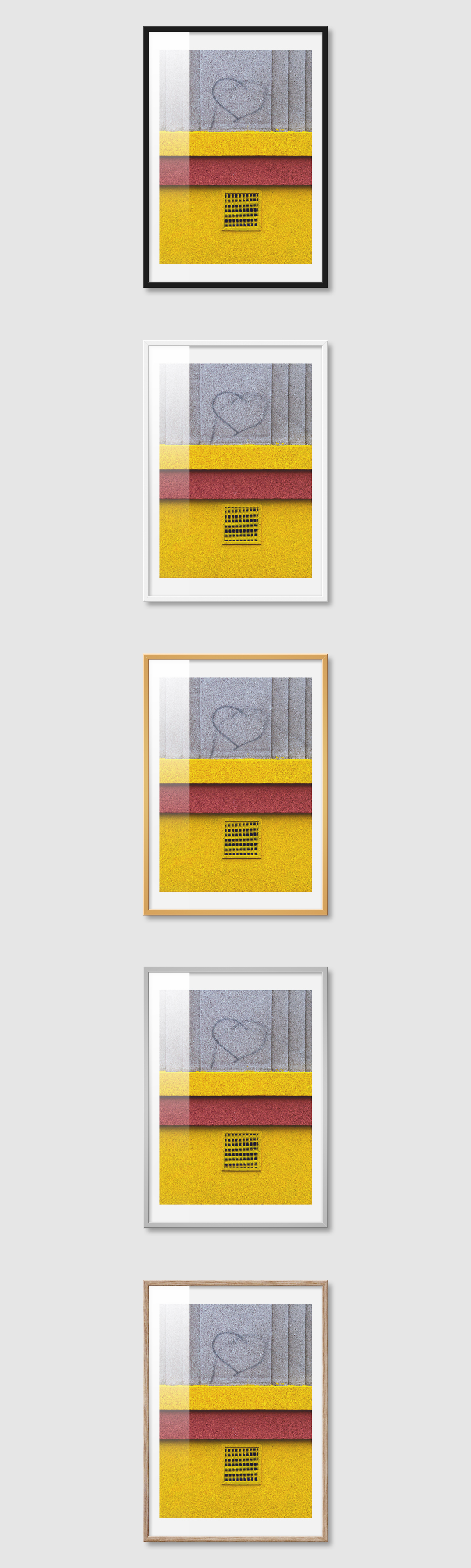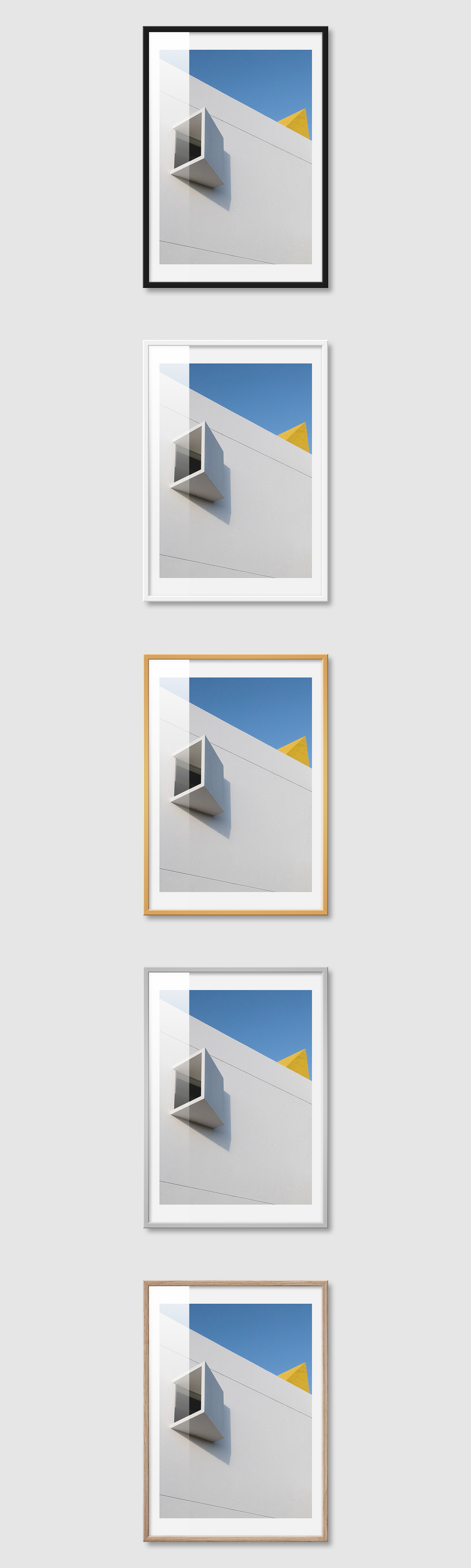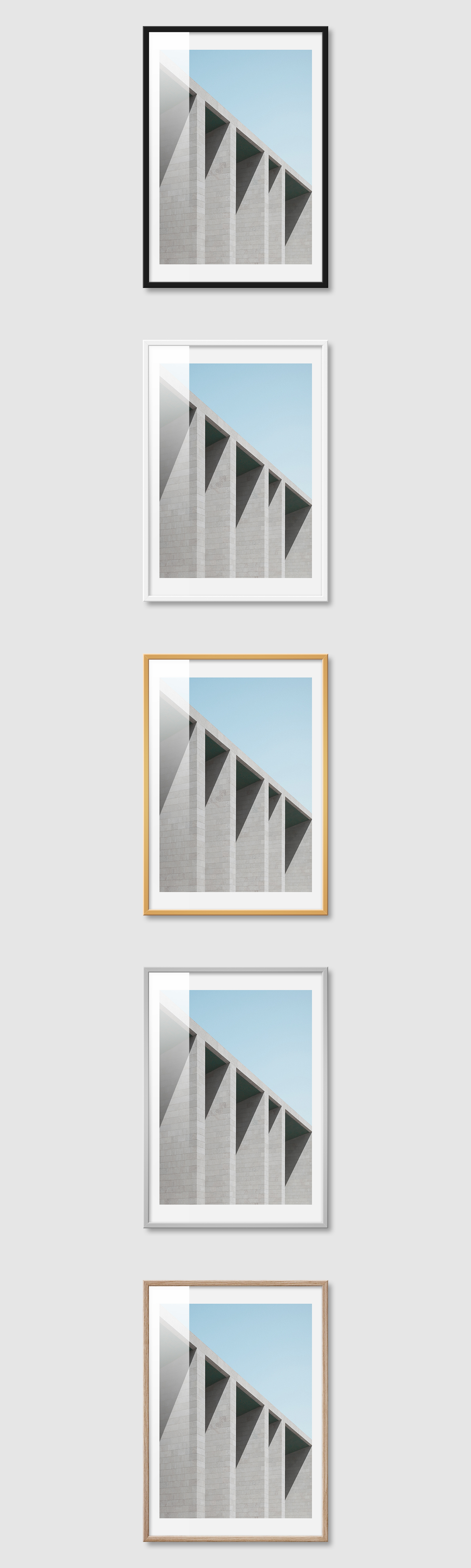5가지 색상의 프레임 왼쪽부터 블랙, 화이트, 골드, 실버, 우드(무늬목)