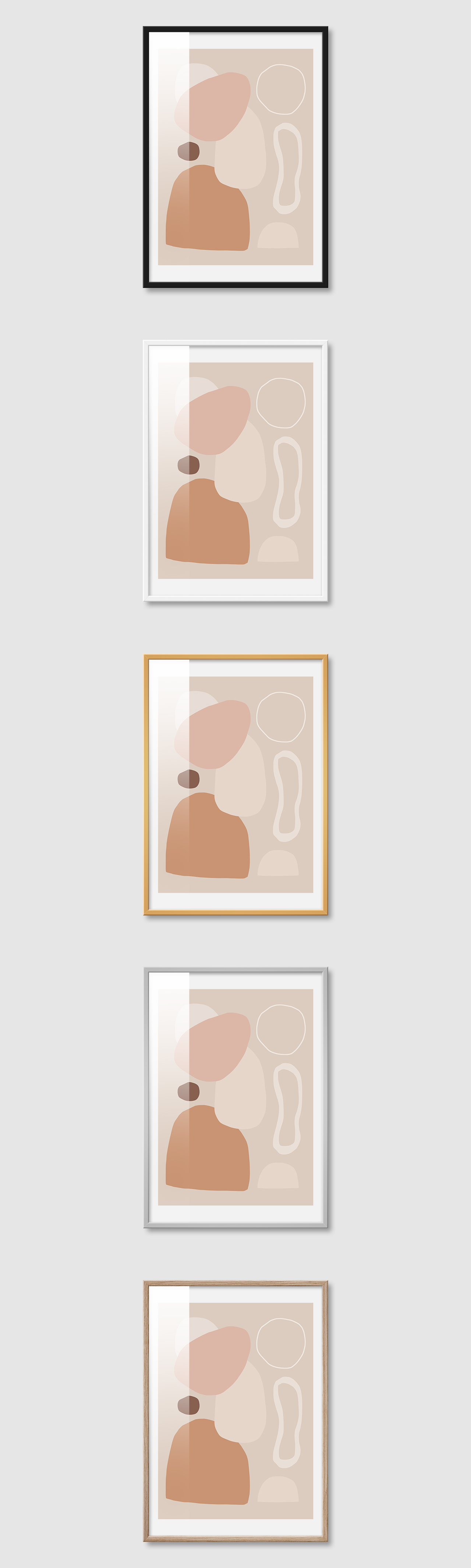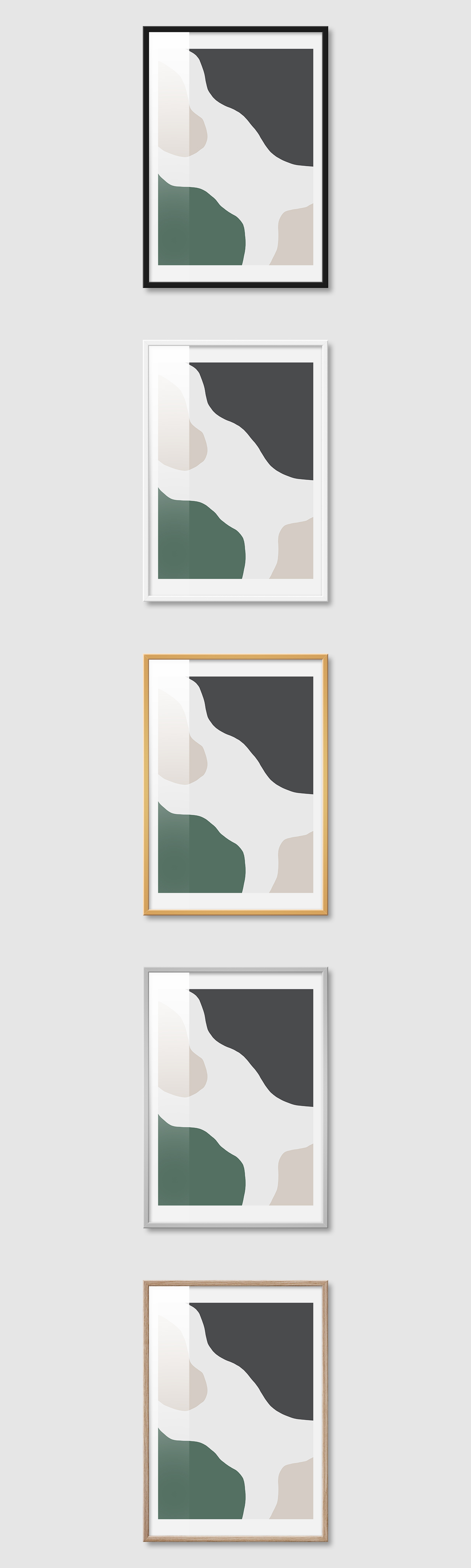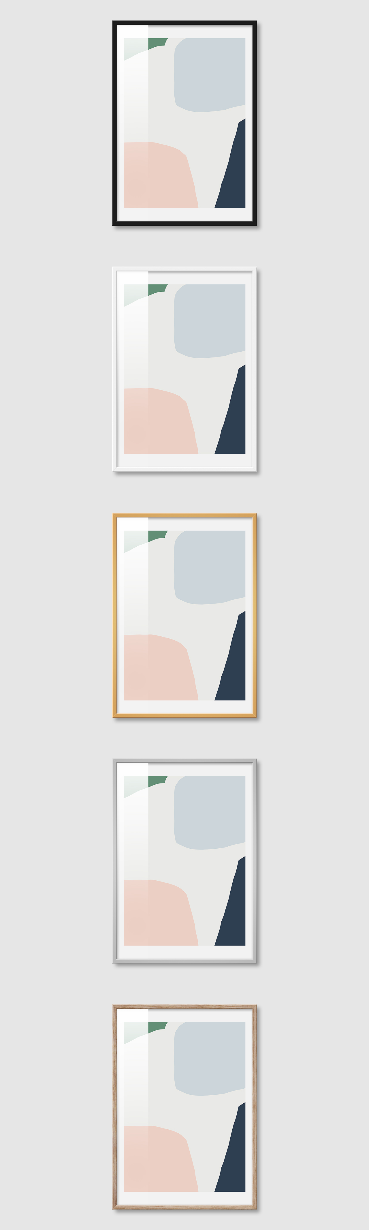 5가지 색상의 프레임 왼쪽부터 블랙, 화이트, 골드, 실버, 우드(무늬목)