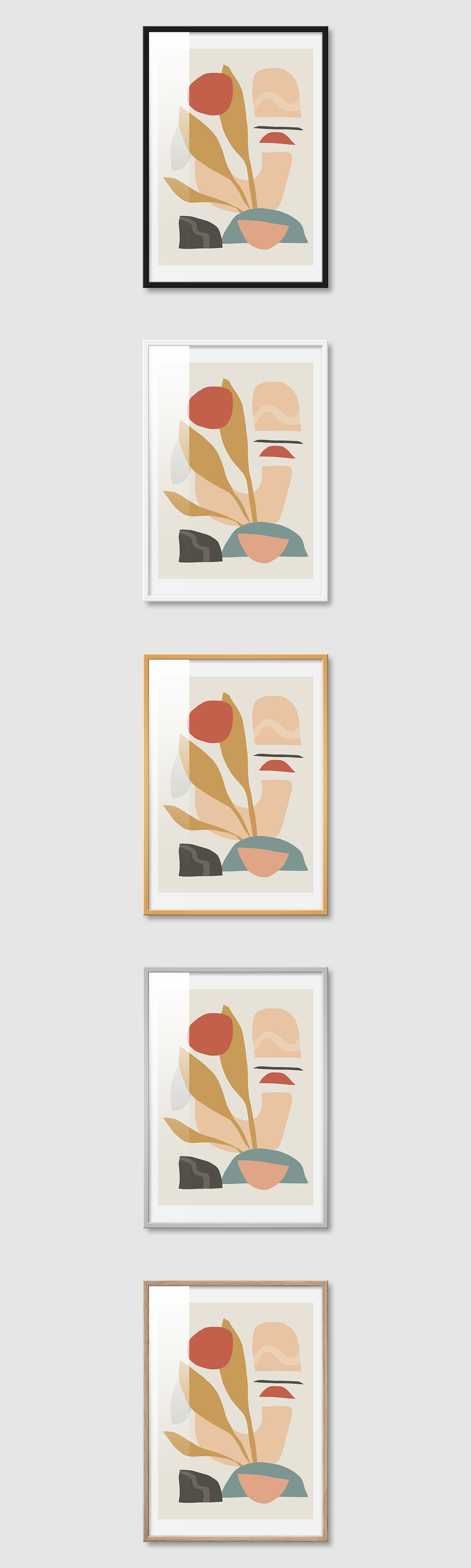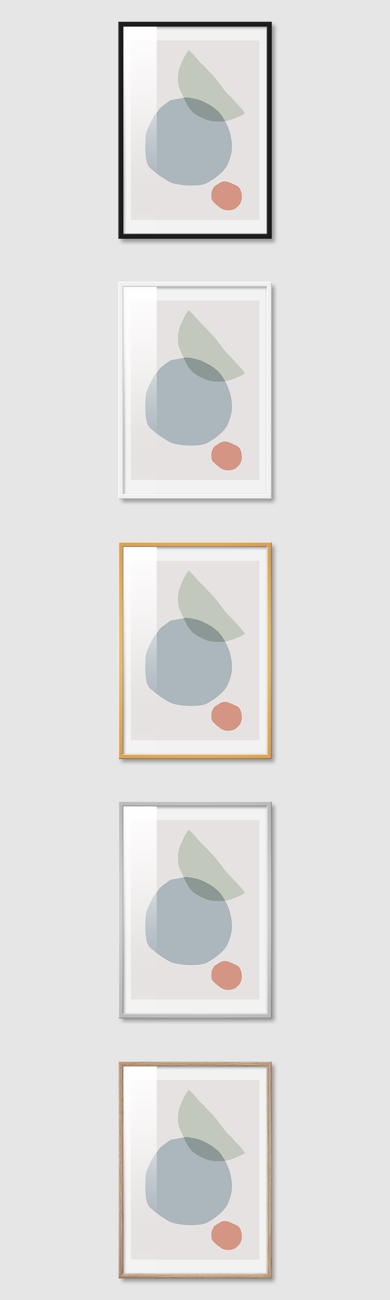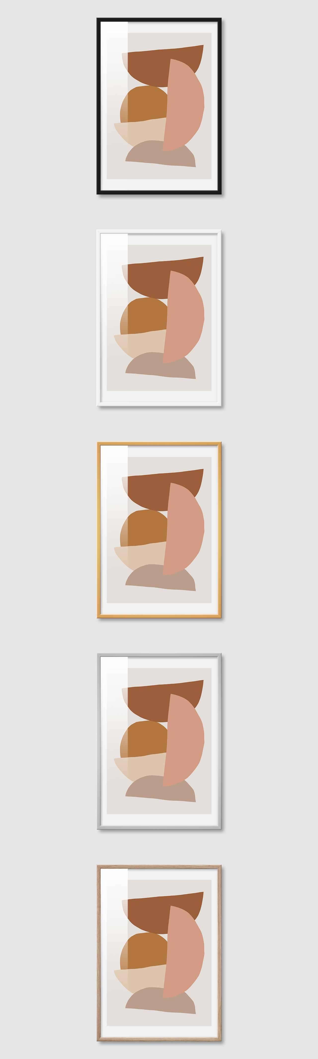 5가지 색상의 프레임 왼쪽부터 블랙, 화이트, 골드, 실버, 우드(무늬목)