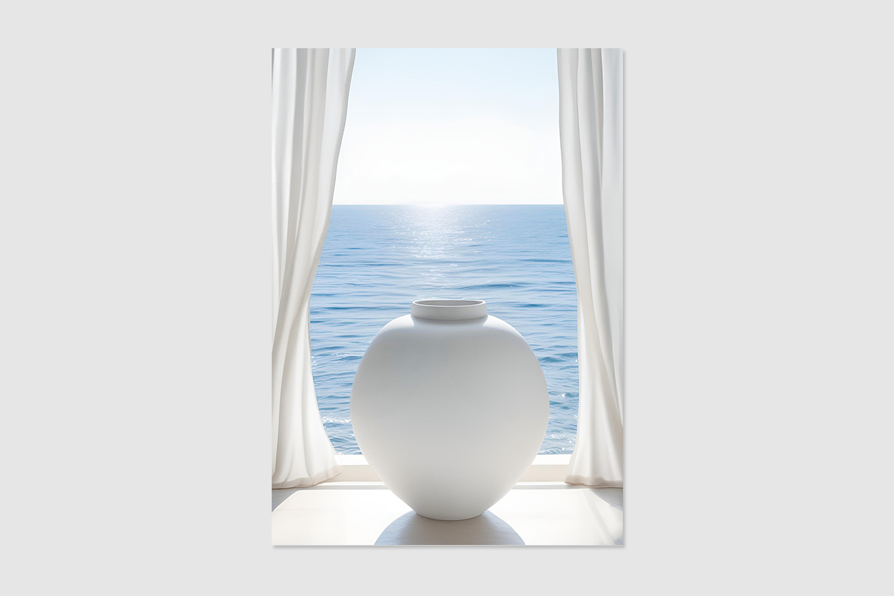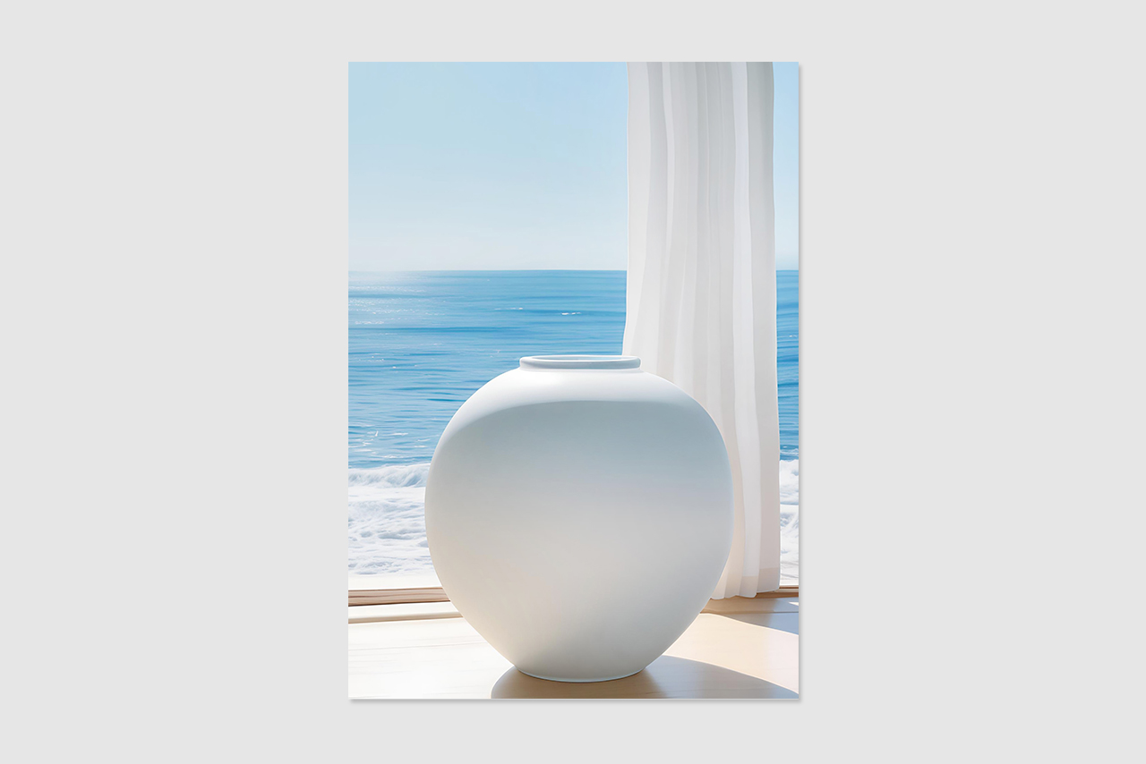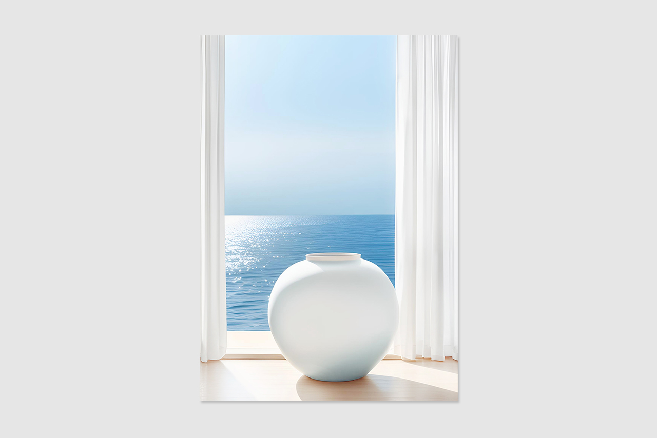 넓게 펼쳐진 바다와 고요한 달항아리가