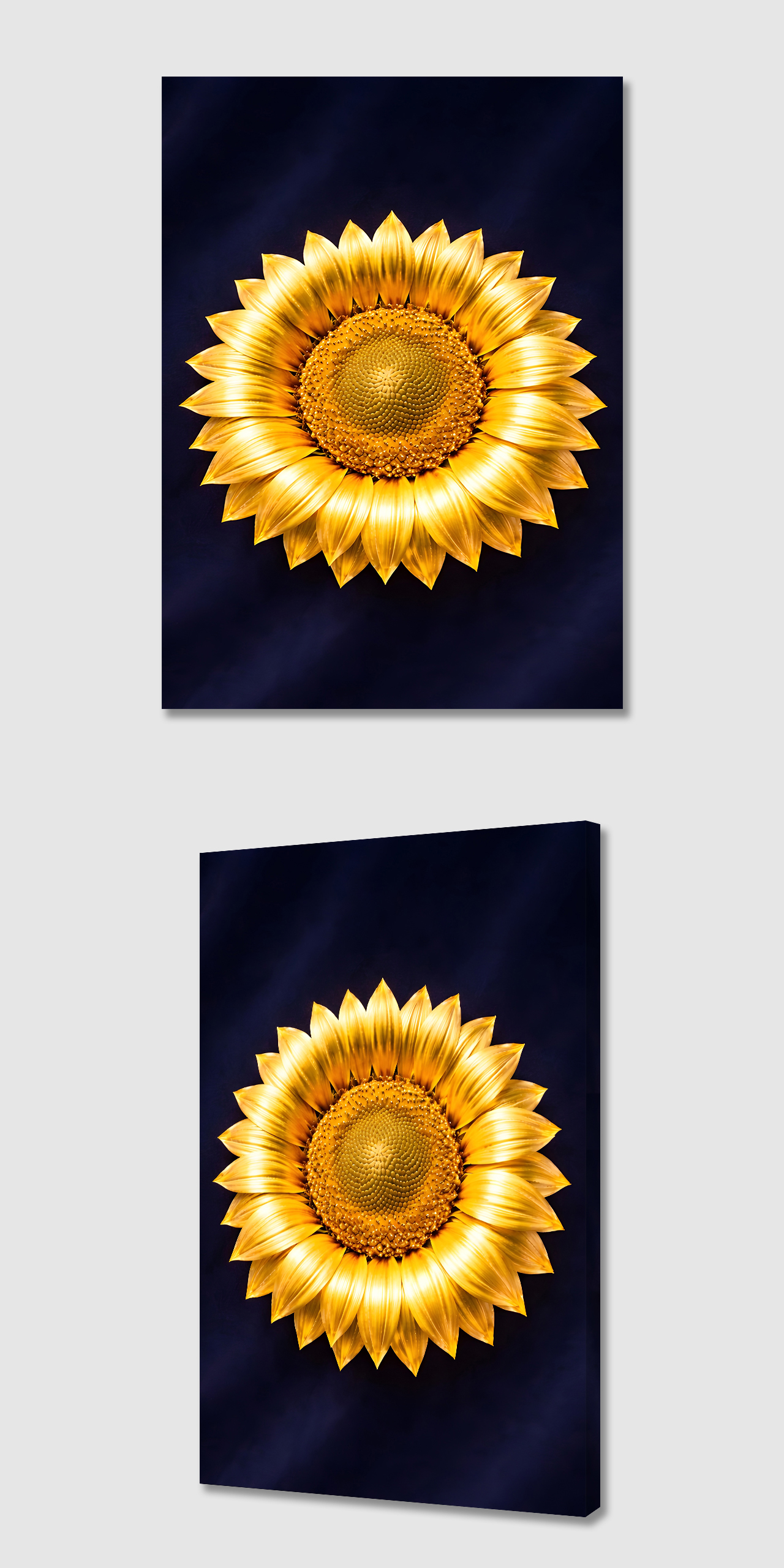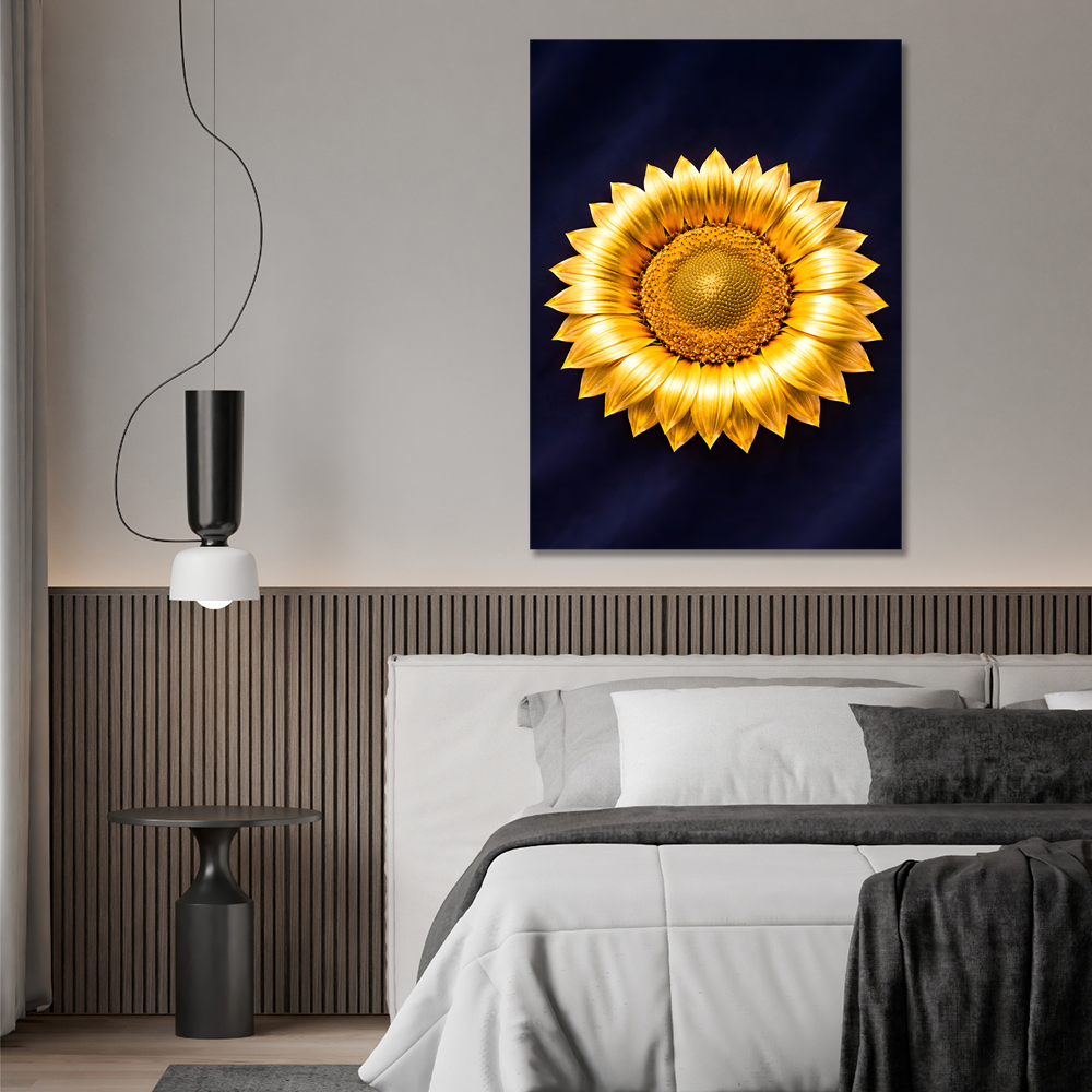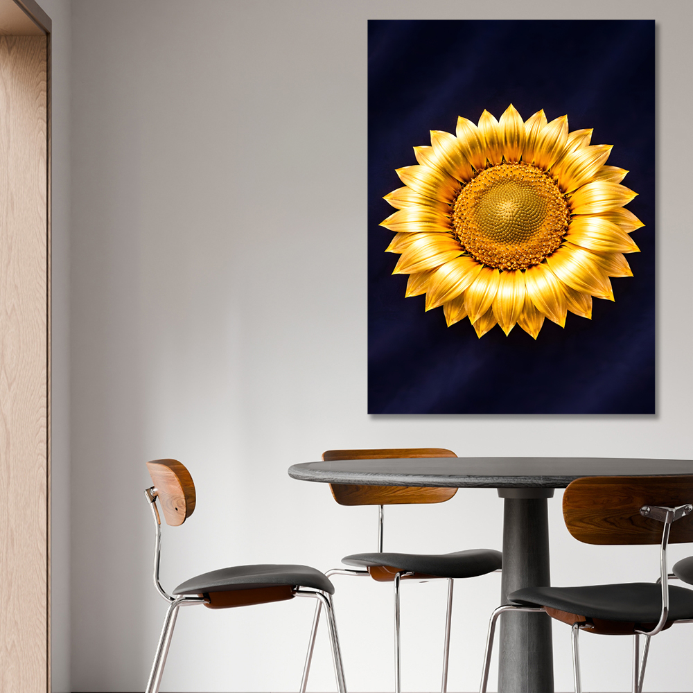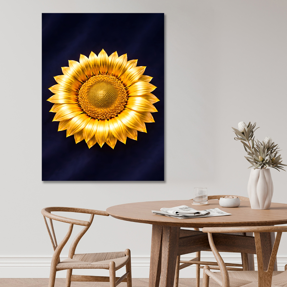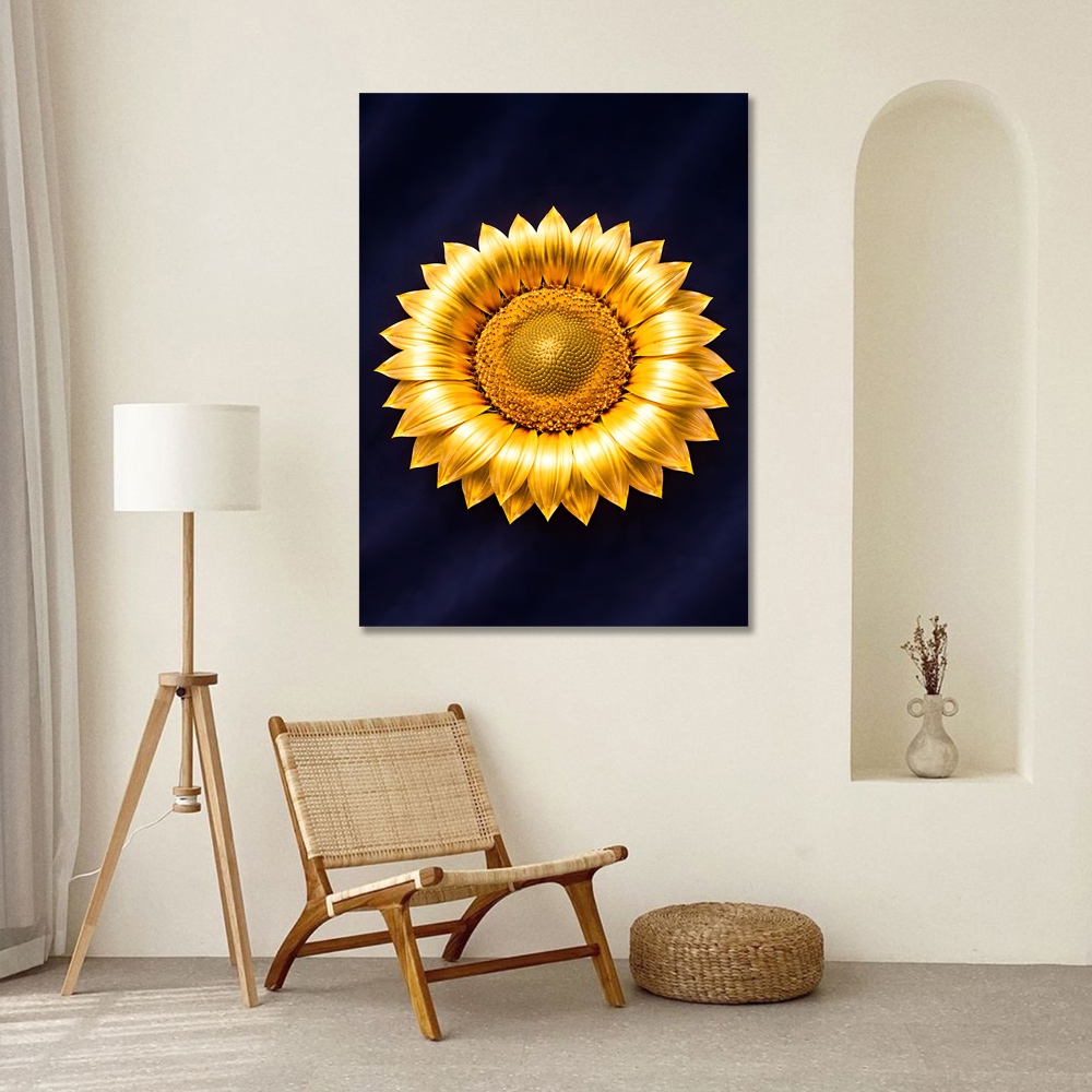 다크 네이비 벨벳 위에 놓여진 황금 해바라기는