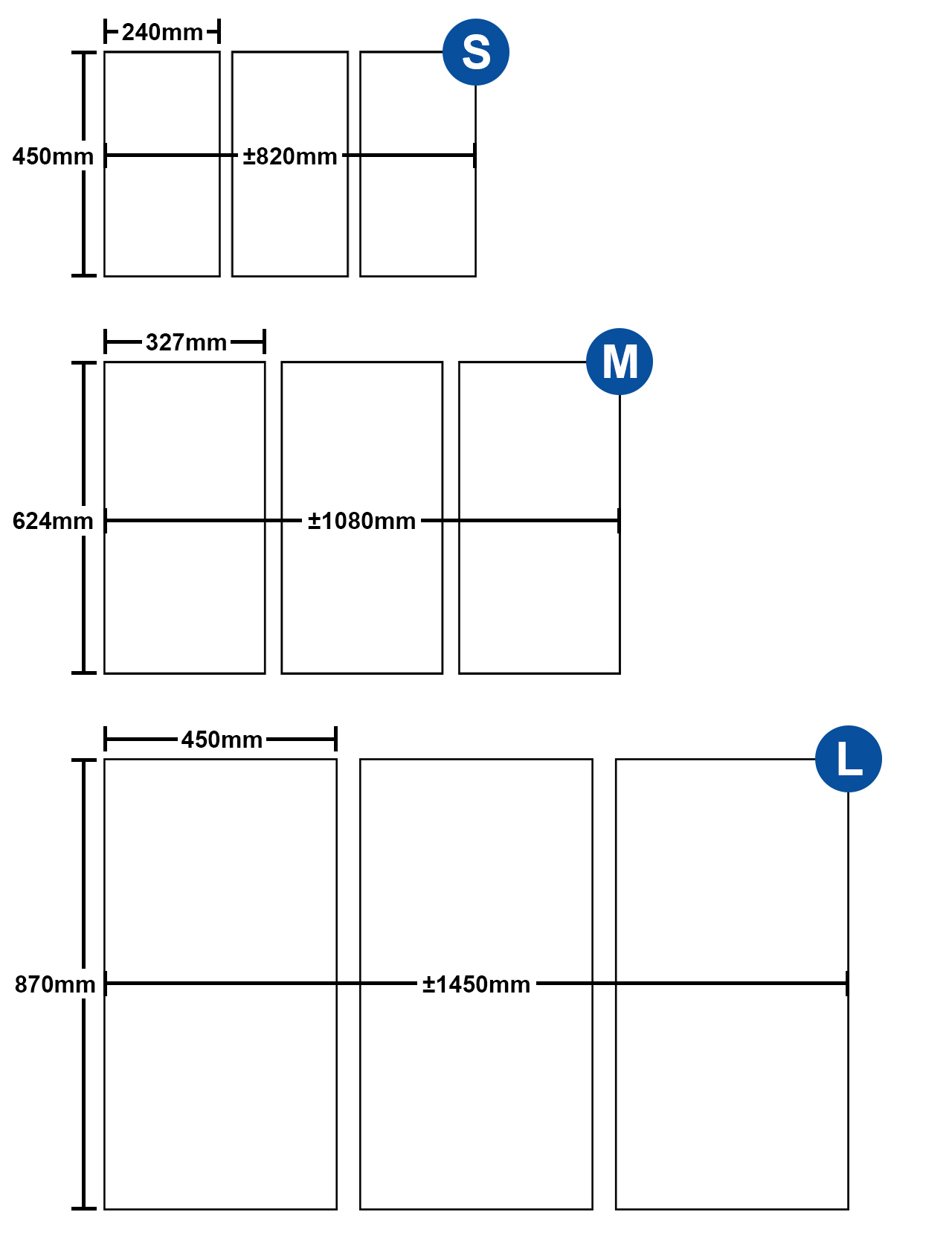 소형 240 x 450mm / 중형 327 x 624mm / 대형 450 x 870mm