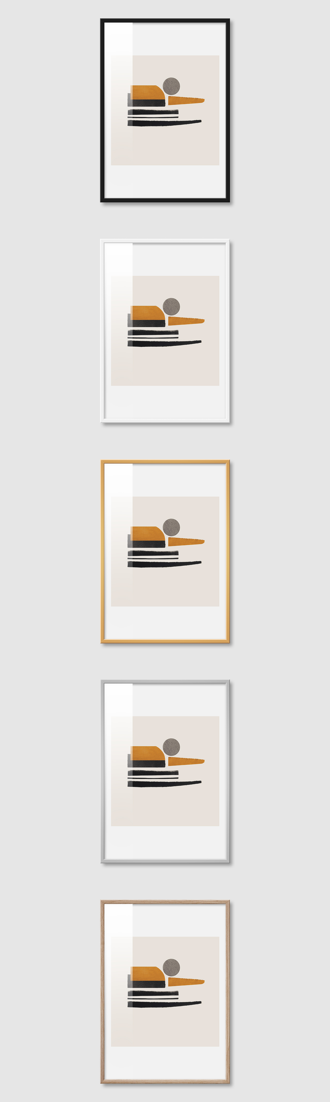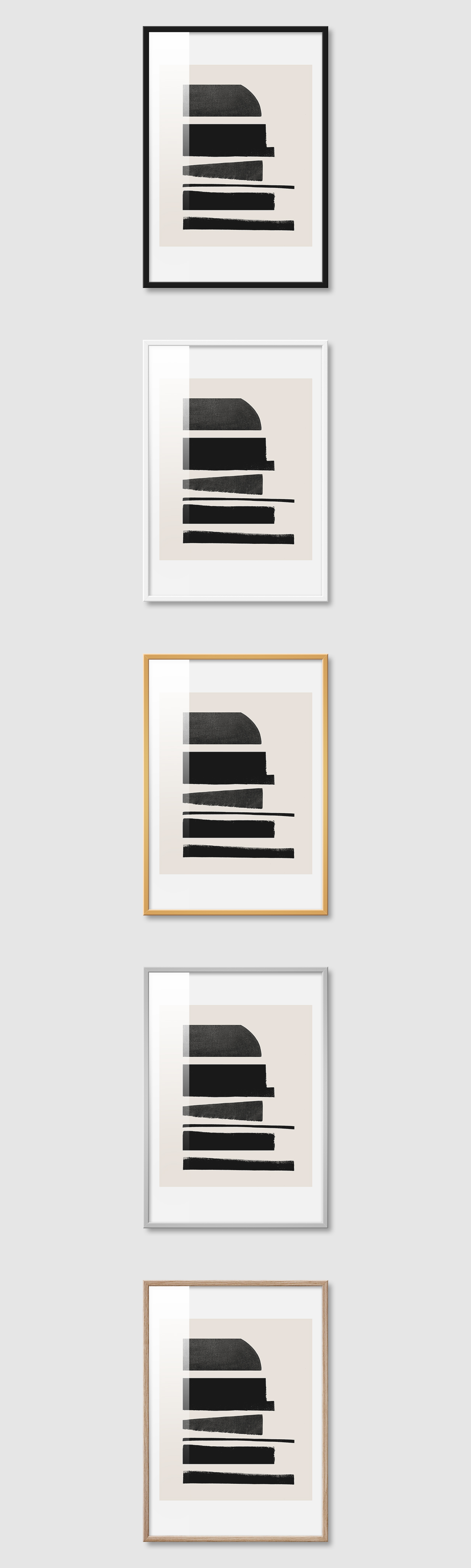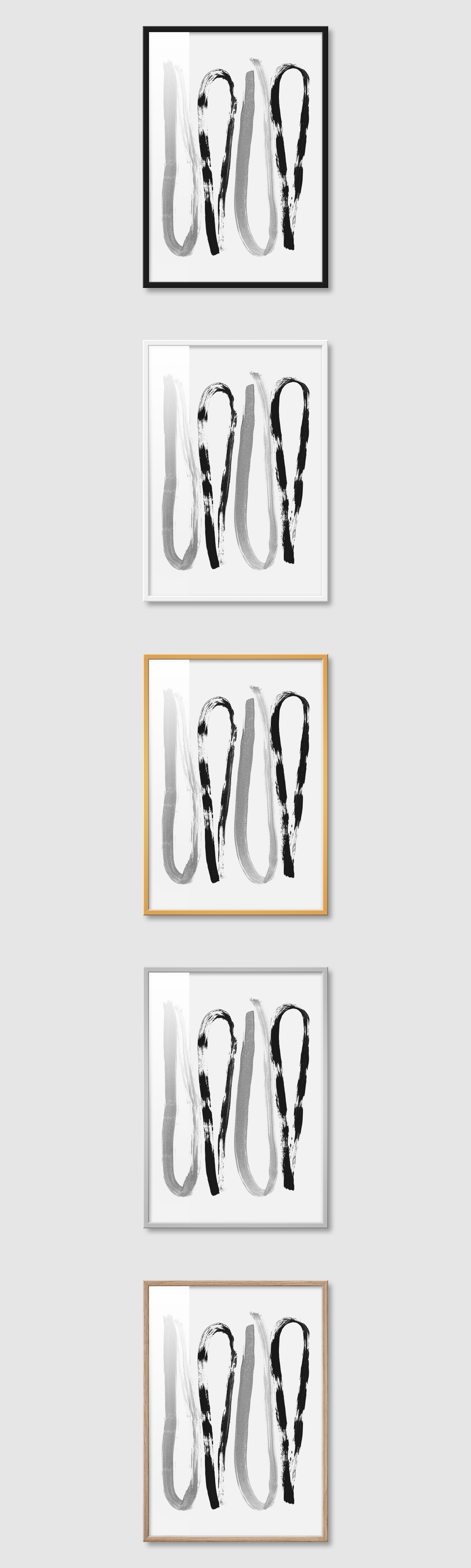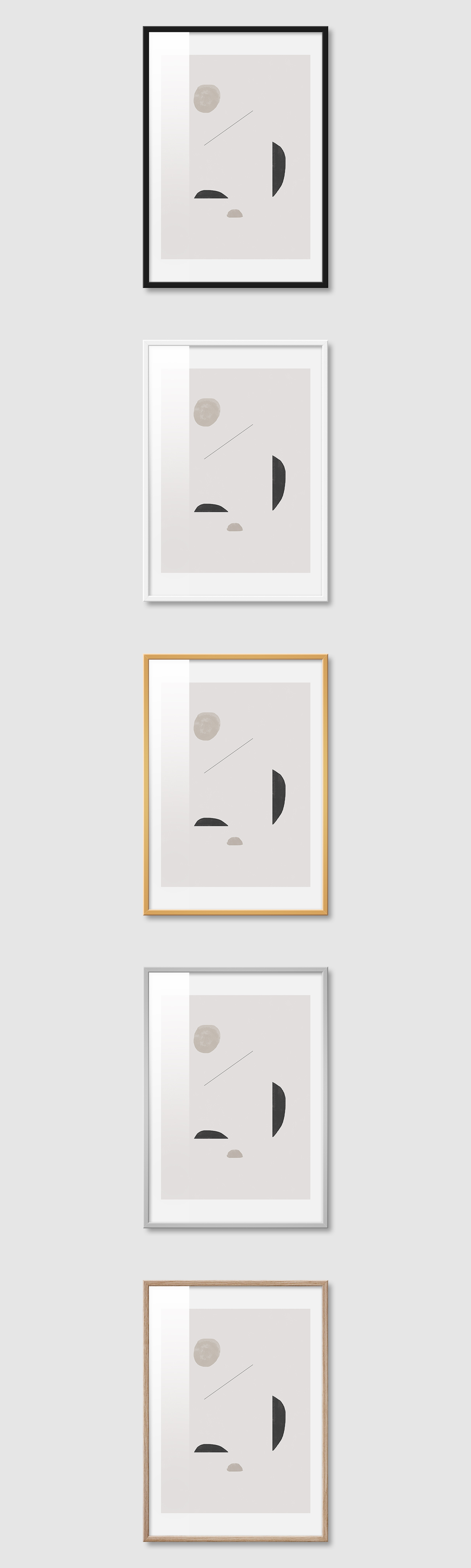 5가지 색상의 프레임 왼쪽부터 블랙, 화이트, 골드, 실버, 우드(무늬목)